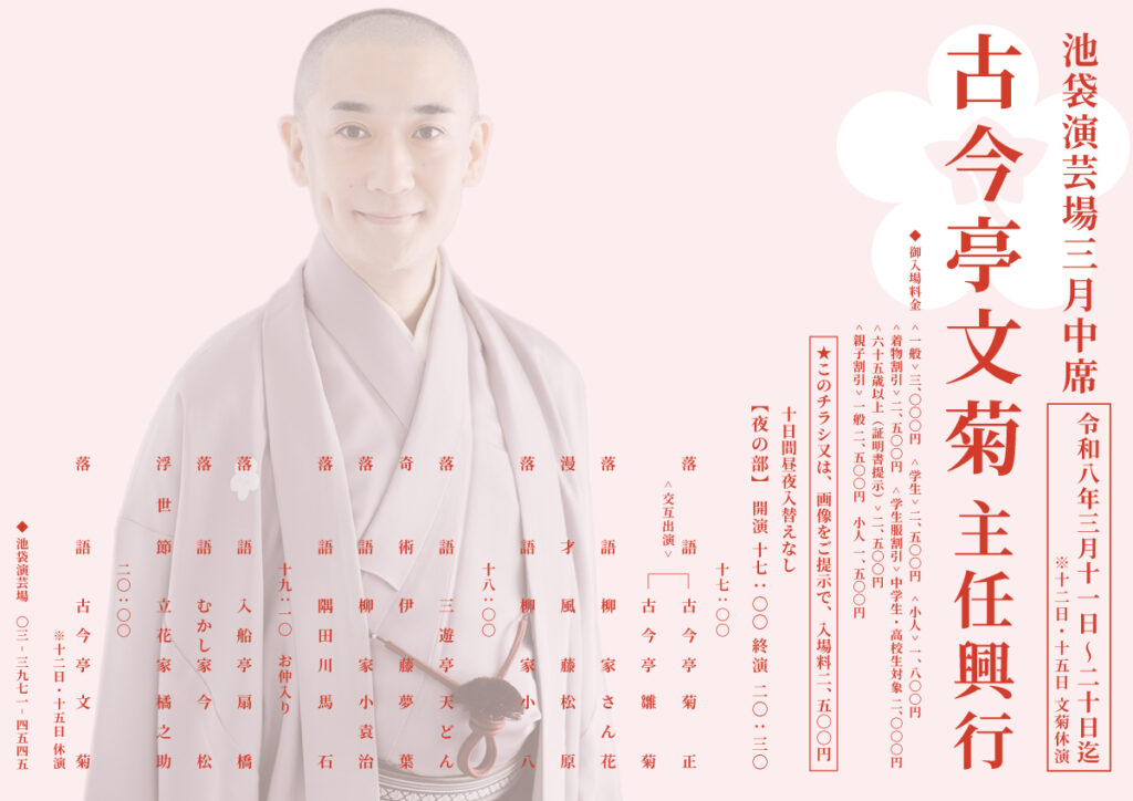 池袋演芸場3月中席(11日〜20日)夜の部は、古今亭文菊主任興行となっております。(12日、15日は休演)