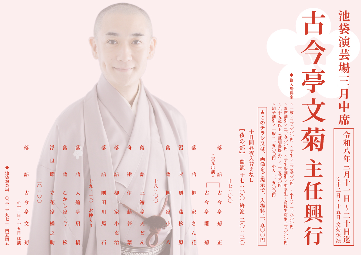 池袋演芸場3月中席(11日〜20日)夜の部は、古今亭文菊主任興行となっております。(12日、15日は休演)